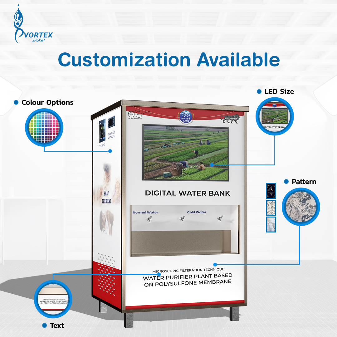 The Vortex Splash Pure Gold+ exemplifies the forefront of advanced water purification technology proudly bearing the esteemed endorsement of BARC .This advanced filtration system ensures the provision of clean and safe drinking water. Its built-in Wi-Fi facilitates a 32-inch LED screen serving as an excellent medium for advertisements, promotion and community information. Furthermore, this state-of-the-art cooler features digital indicators including a TDS monitor, temperature controller, water inflow, water outflow meters and a Filter change alarm With a generous storage capacity of 200 litres, it guarantees a steady supply of purified water. Additionally, the purifiers can customize the cooler's colour and design allowing it to seamlessly blend with their unique preferences and surroundings.