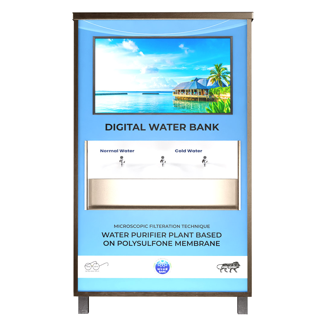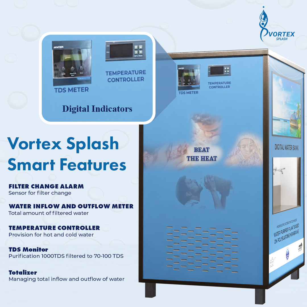 The Vortex Splash Ultra Lite, a pinnacle of modern engineering, proudly incorporates advanced filtration technology endorsed by the prestigious BARC. This innovative system features built-in Wi-Fi and a 42-inch LED display serving as an effective medium for advertisements, promotions and public awareness. This purification system is equipped with digital indicators including a TDS monitor, temperature controller, water inflow and water outflow meters and a totalizer. It also boasts a filter change alarm that alerts users precisely when maintenance is required ensuring consistent water purity around the clock. With a substantial storage capacity of 400 litres this sleek design offers abundant customisation options allowing you to modify the colour and design to perfectly match your preferences and surroundings.