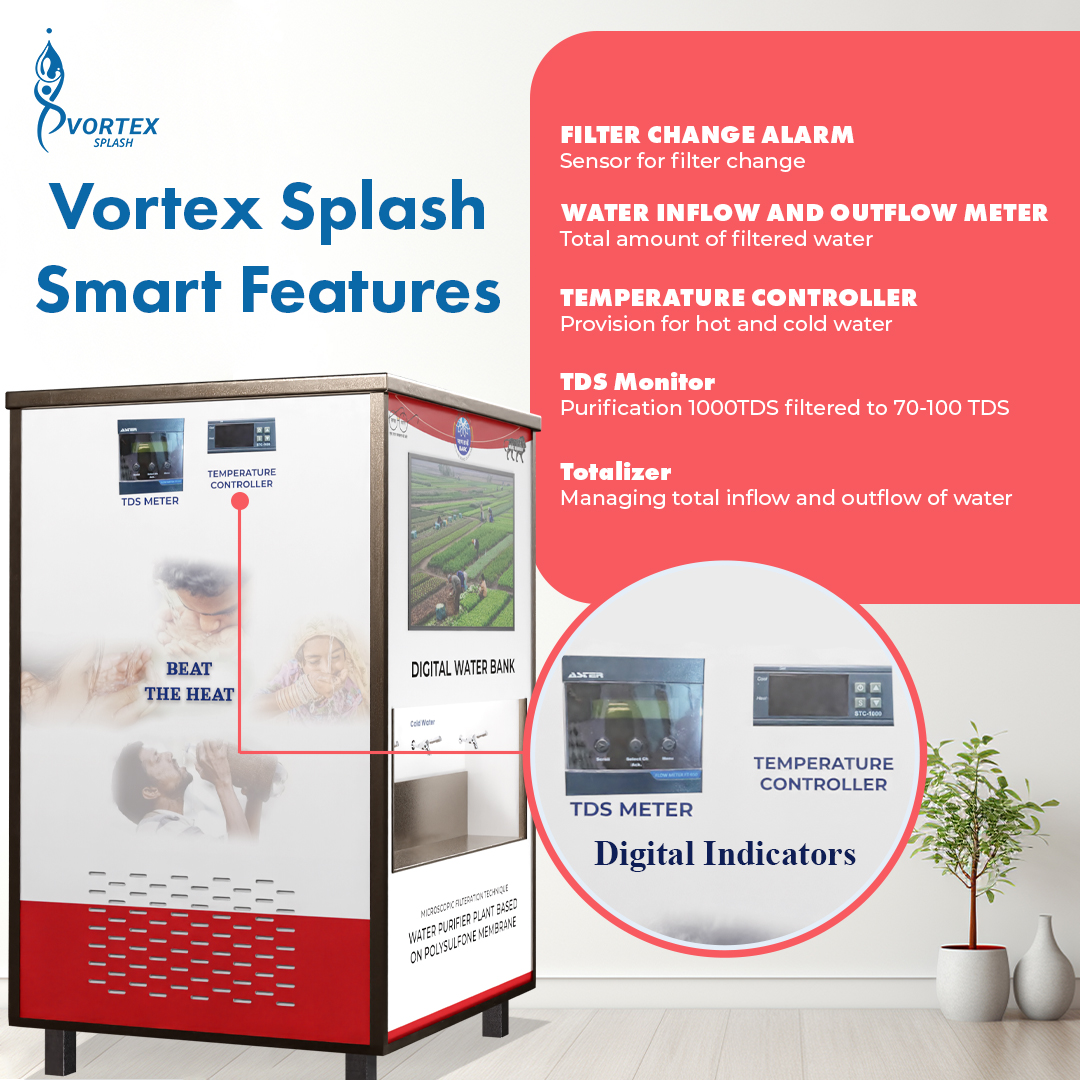 The Vortex Splash Pure Gold+ exemplifies the forefront of advanced water purification technology proudly bearing the esteemed endorsement of BARC .This advanced filtration system ensures the provision of clean and safe drinking water. Its built-in Wi-Fi facilitates a 32-inch LED screen serving as an excellent medium for advertisements, promotion and community information. Furthermore, this state-of-the-art cooler features digital indicators including a TDS monitor, temperature controller, water inflow, water outflow meters and a Filter change alarm With a generous storage capacity of 200 litres, it guarantees a steady supply of purified water. Additionally, the purifiers can customize the cooler's colour and design allowing it to seamlessly blend with their unique preferences and surroundings.