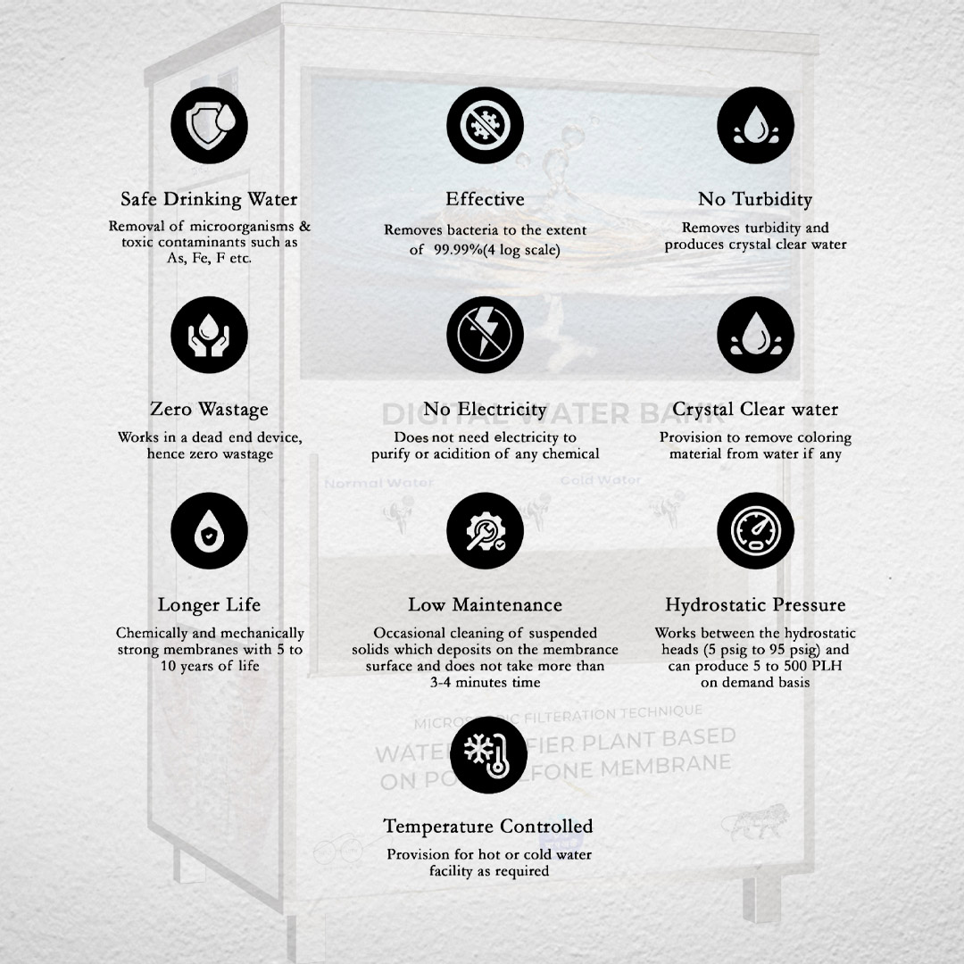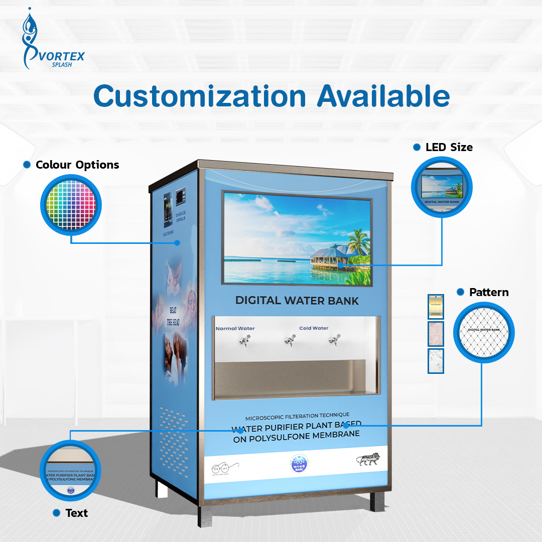 The Vortex Splash Ultra Lite, a pinnacle of modern engineering, proudly incorporates advanced filtration technology endorsed by the prestigious BARC. This innovative system features built-in Wi-Fi and a 42-inch LED display serving as an effective medium for advertisements, promotions and public awareness. This purification system is equipped with digital indicators including a TDS monitor, temperature controller, water inflow and water outflow meters and a totalizer. It also boasts a filter change alarm that alerts users precisely when maintenance is required ensuring consistent water purity around the clock. With a substantial storage capacity of 400 litres this sleek design offers abundant customisation options allowing you to modify the colour and design to perfectly match your preferences and surroundings.
