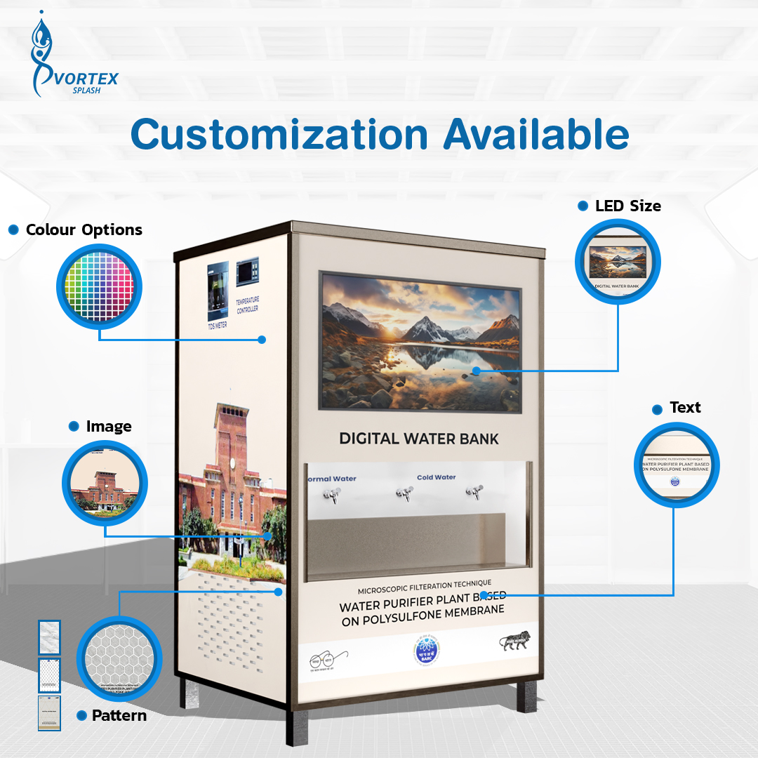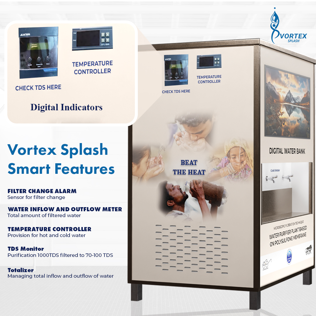 The Vortex Splash Ultra heralds a new era in water purification distinguished by the esteemed endorsement of BARC technology. This advanced filtration system is further enhanced by built-in Wi-Fi and a 45-inch LED display ideal for advertisements, promotions and public awareness campaigns. Noteworthy features include digital indicators such as a TDS monitor, temperature controller, water inflow, water outflow meters and a totalizer which are all complemented by a filter change alarm. It comes with the substantial storage capacity of 500 litres ensuring a consistent supply of purified water. Significantly, prospective users are afforded the opportunity to customize the colour and design of the unit to harmonise with their specific surroundings thereby achieving an unparalleled integration of functionality and aesthetic appeal.